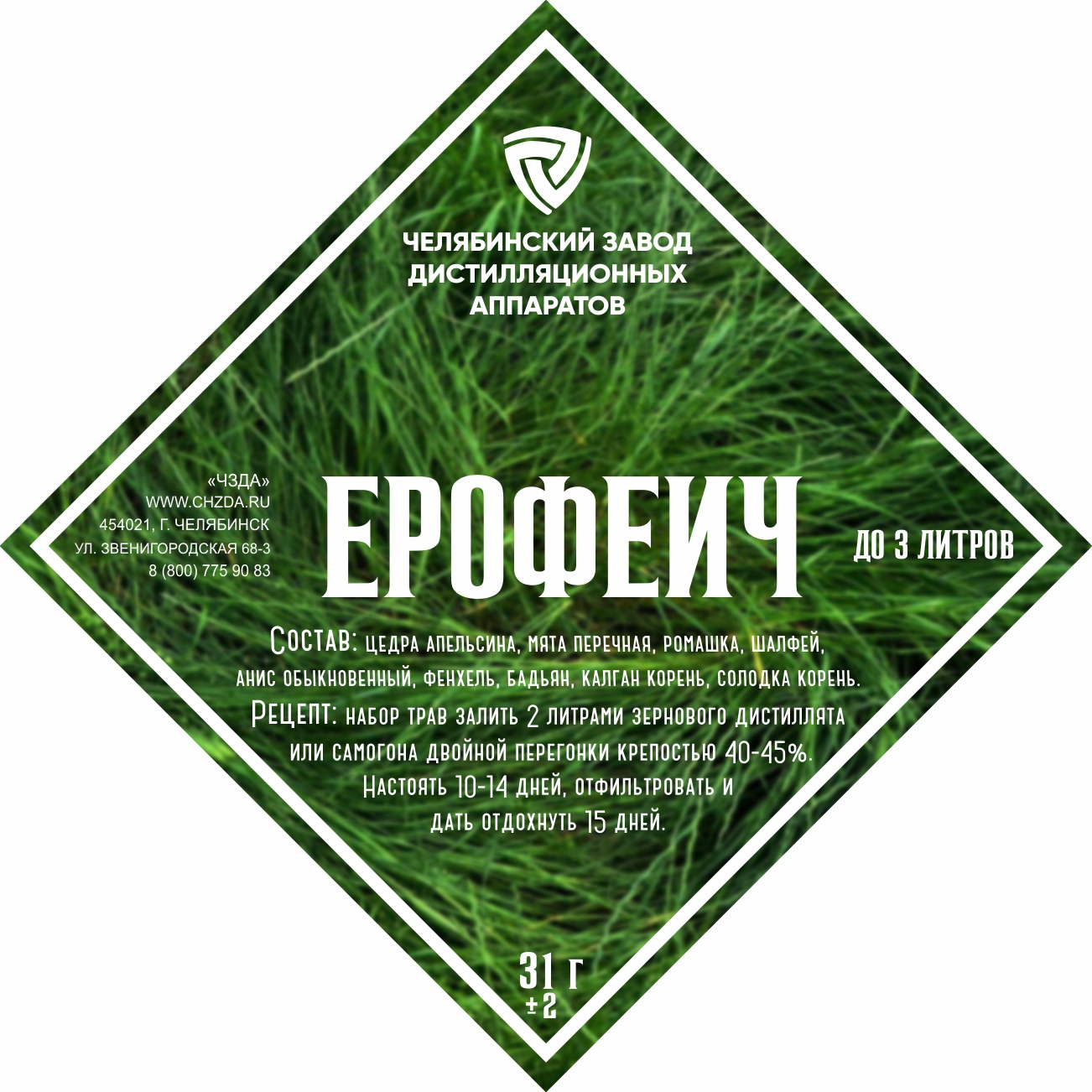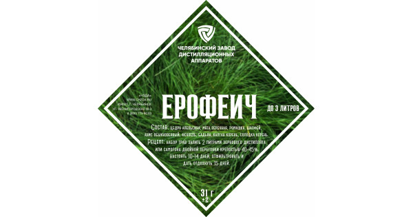 The set of herbs and spices "Erofeiich" includes: anise ordinary, baden, kalgan root, orange peel, peppermint, chamomile flowers, licorice, fennel, sage.
