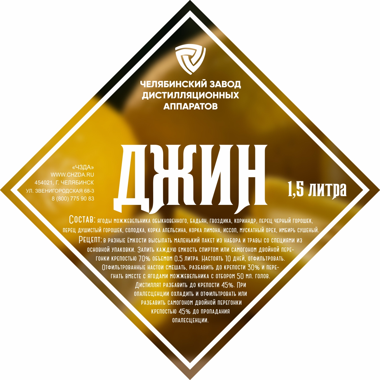 The set of herbs and spices "Jin" includes: juniper berries, tubberry, cloves, coriander, black pepper peas, sweet pepper peas, licorice, orange peel, lemon peel, hyssop, angelica root, nutmeg, dried ginger.