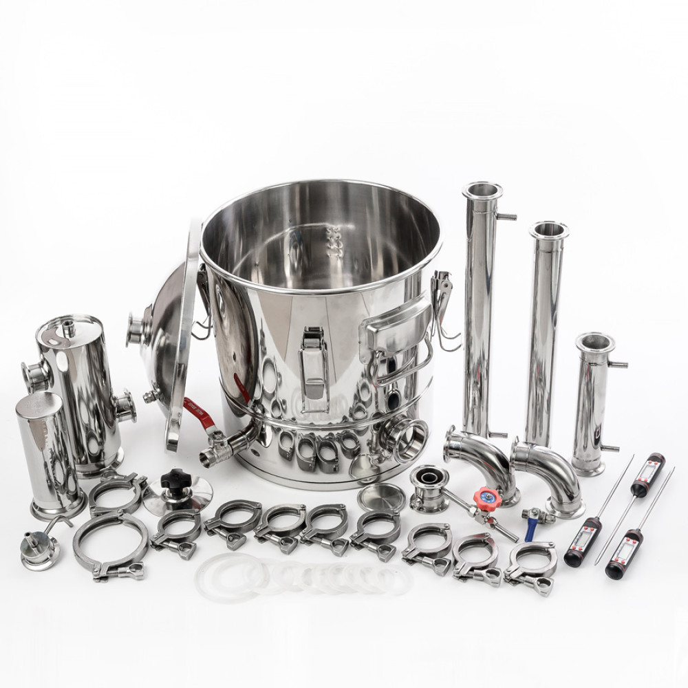 The set is able to cover the needs for any type of drink - vodka, moonshine, whiskey, cognac, liqueurs. The stainless steel gin basket makes it easy to flavor the finished drink using gin technology without placing herbs and berries in gauze bags. In addition, an internal groove is made on the distillation cube for a quick and easy installation of a false bottom to avoid burning thick fragrant bregs. There are technological units for collecting heads and draining the accumulated fusel oils in the gin basket without stopping the working cycle. The cube is equipped with a reliable thermometer, and an electronic thermometer in the column allows you to control the operating mode of the mash column.