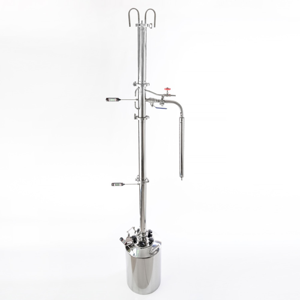 CheckoutThe set of equipment differs significantly from outdated moonshine stills with dry steamers, here the strengthening of the alcohol mixture is much more efficient due to the supply of water to the Dimrot refrigerator, and not just the pressure drop in the dry steamer. Also, the rectifier perfectly separates alcohol from fusel oils, so there is no need for many hours of filtration with coal, milk and egg proteins.
