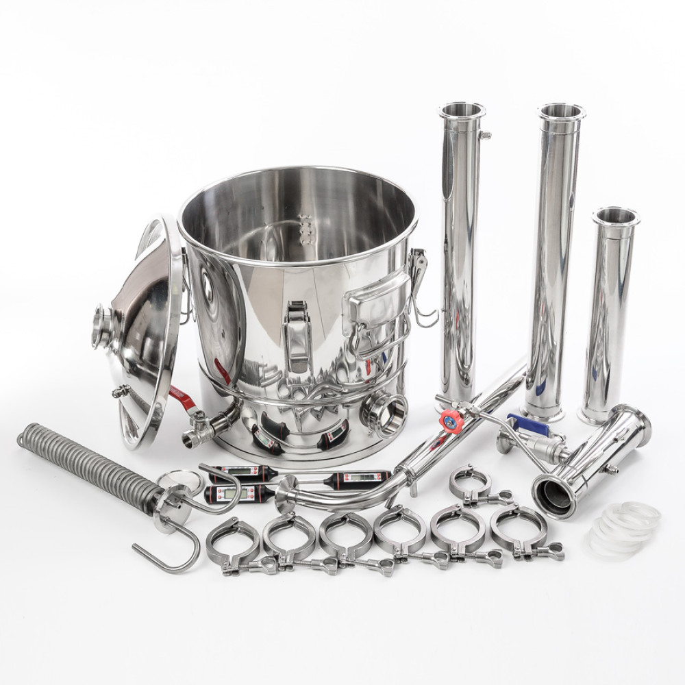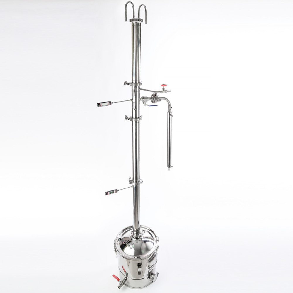 Another reason to buy a 2-inch distillation column with a 20/300/t dimrot under the heating element is a well-thought-out design of the apparatus, it is easy to work with it and maintenance takes several times less time than with outdated moonshine stills. All parts of the moonshine still dock with each other using quick-detachable clamp connections, so the time for preparing for the distillation of mash or raw alcohol is reduced several times. A wide neck with a diameter of 300 mm provides easy access for cleaning the distillation cube, and an internal groove around the circumference allows you to install a false bottom with a diameter of 300 mm to prevent sticking of thick mash. The cube capacity of 20 liters is optimal for operation without the help of friends or relatives. Additionally, in the lower part, already in the initial configuration, a ball drain valve is installed for convenient and safe removal of the stillage remaining after distillation.